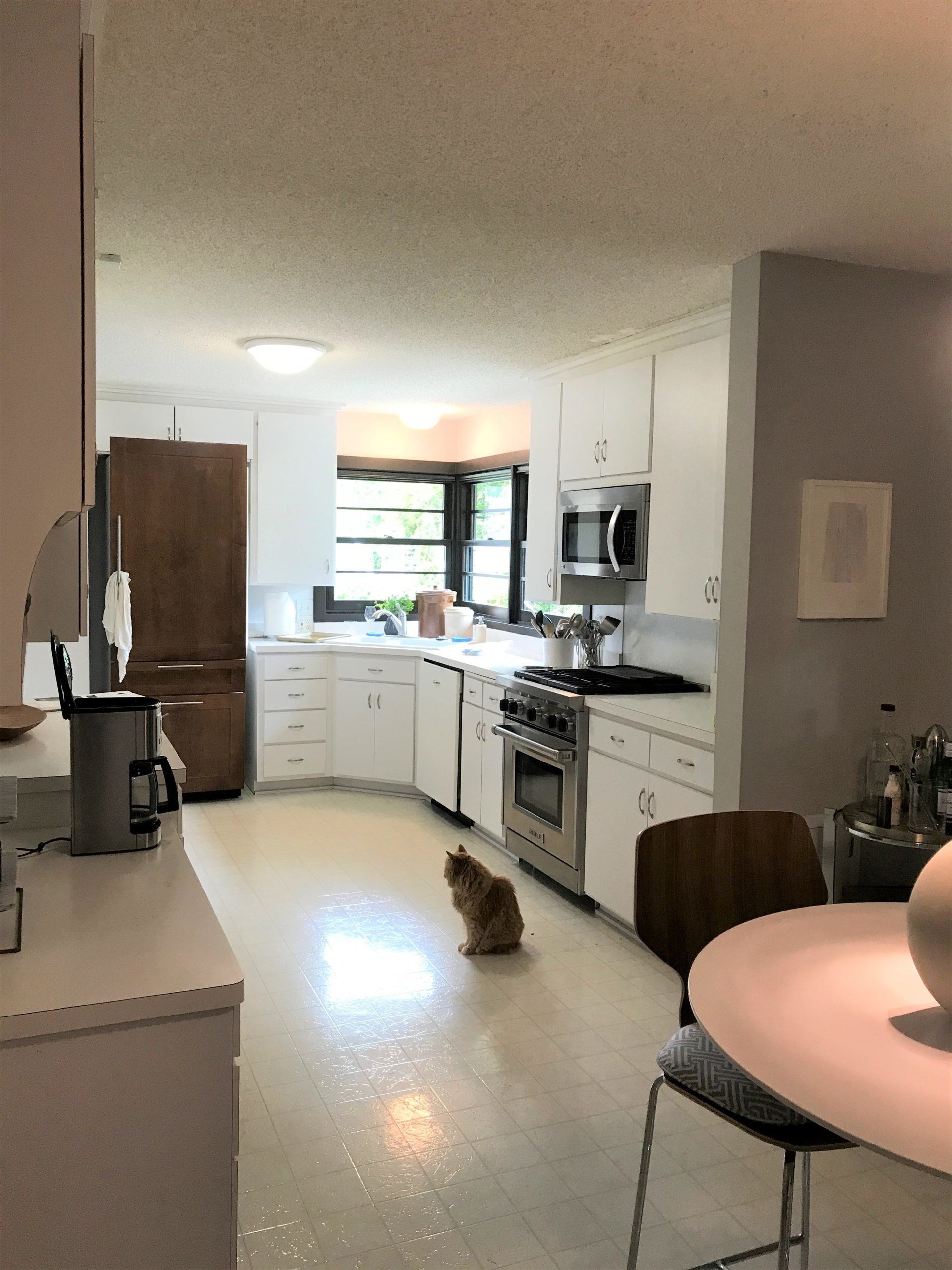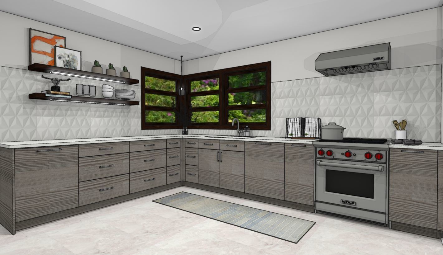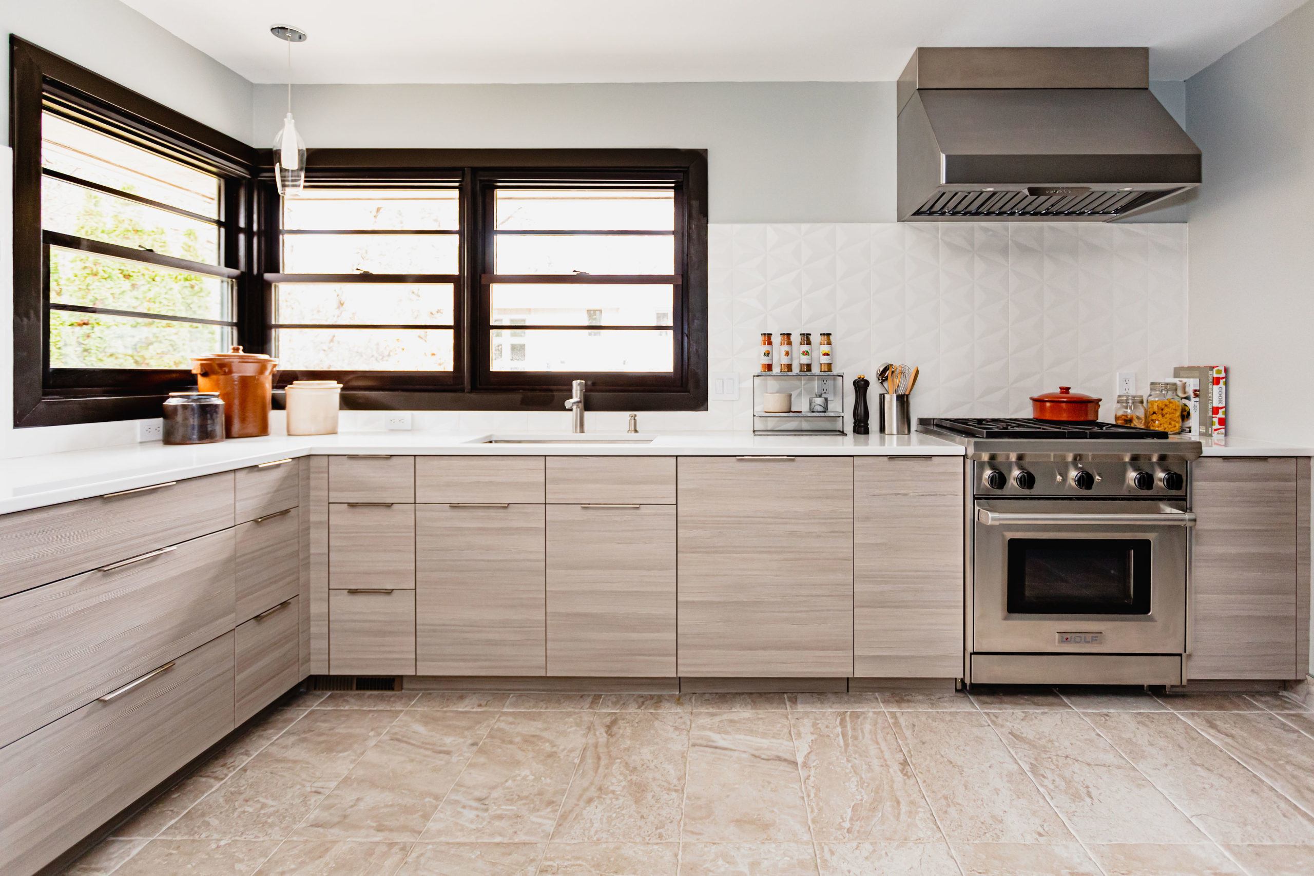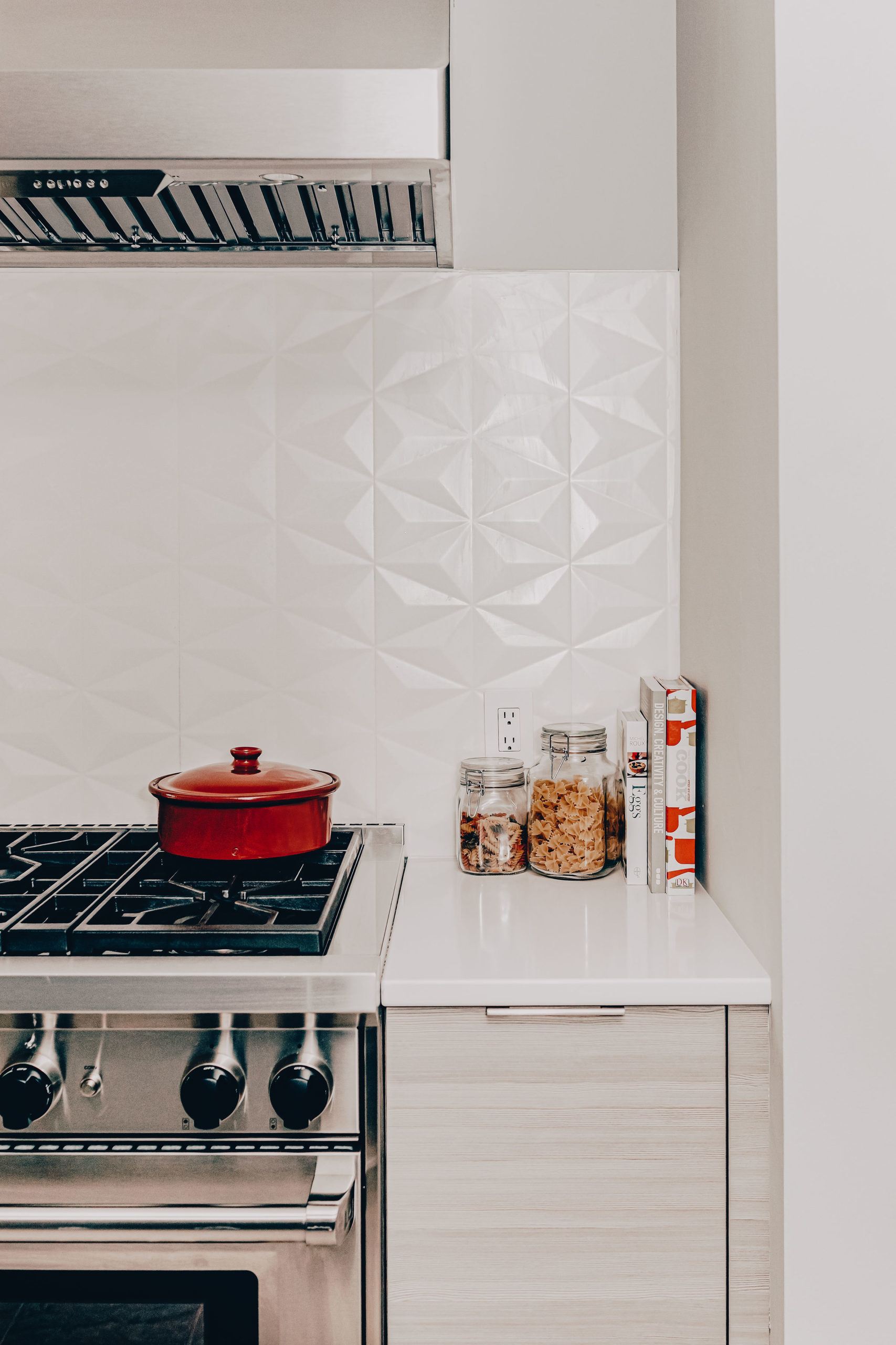 To increase the efficiency of the space, the layout of the kitchen was reconfigured to create a more functional work triangle between the range, the refrigerator, and the sink. The new layout allows the homeowners to prep, cook and serve food with ease. To further enhance the modern look of the kitchen and accommodate our clients’ wishes, floating shelves and a full-height backsplash was chosen to give the space a more open feel.