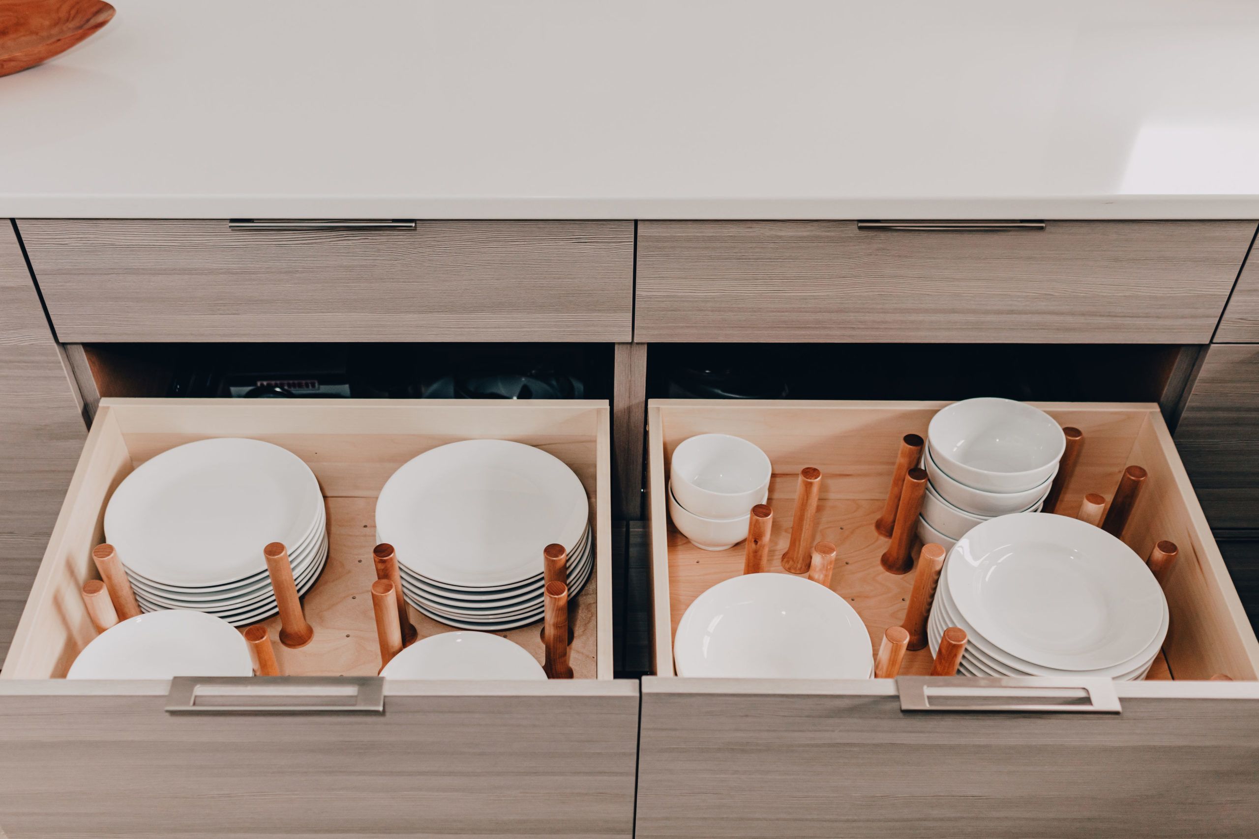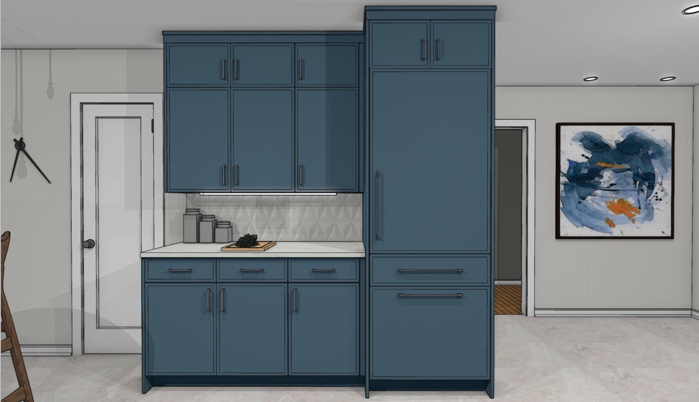 These clients love to cook, so they desired a new kitchen that appealed to them stylistically, while also supporting their passion for cooking. They wanted to include features that would make cooking together both efficient and enjoyable. Our designer fulfilled their dreams by creating a stunning, contemporary design that seamlessly matched the style of the rest of their home. Our designer selected a horizontal, textured laminate by Wynnbrooke Cabinetry for the base perimeter cabinets, with a contrasting prep zone featuring Décor Cabinets in a Behr custom color, Adirondack Blue.