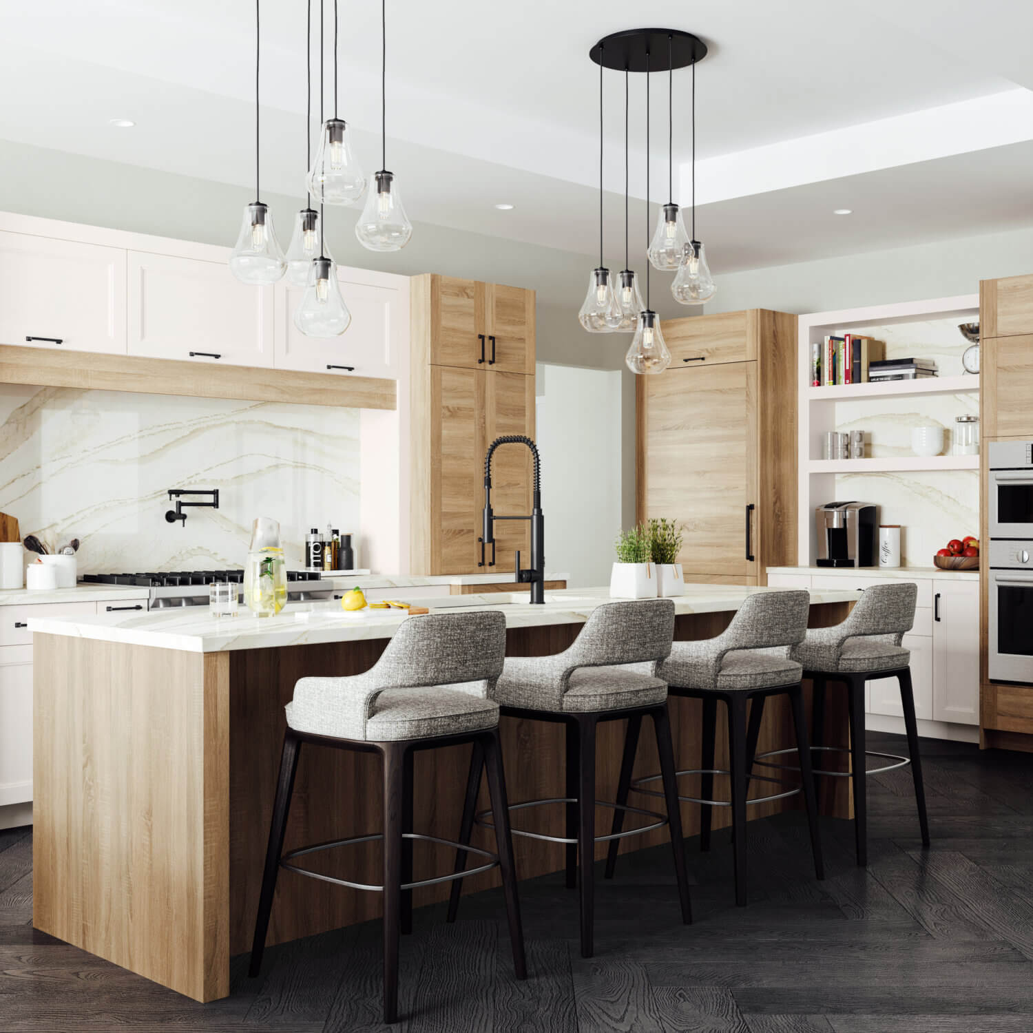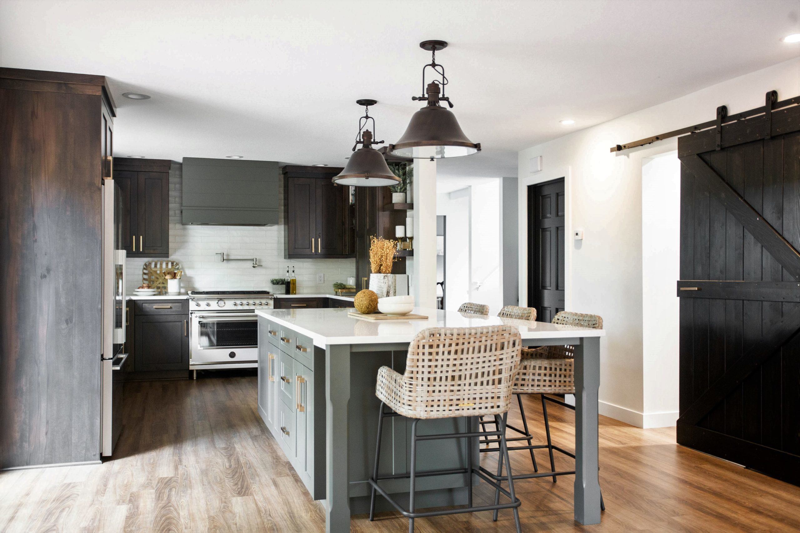 For example, our Rustic Modern kitchen was thoughtfully designed with the warm woods and whites of a Farmhouse space, the clean lines and stainless steel of a Modern space, and rustic elements like the iron bar stools.