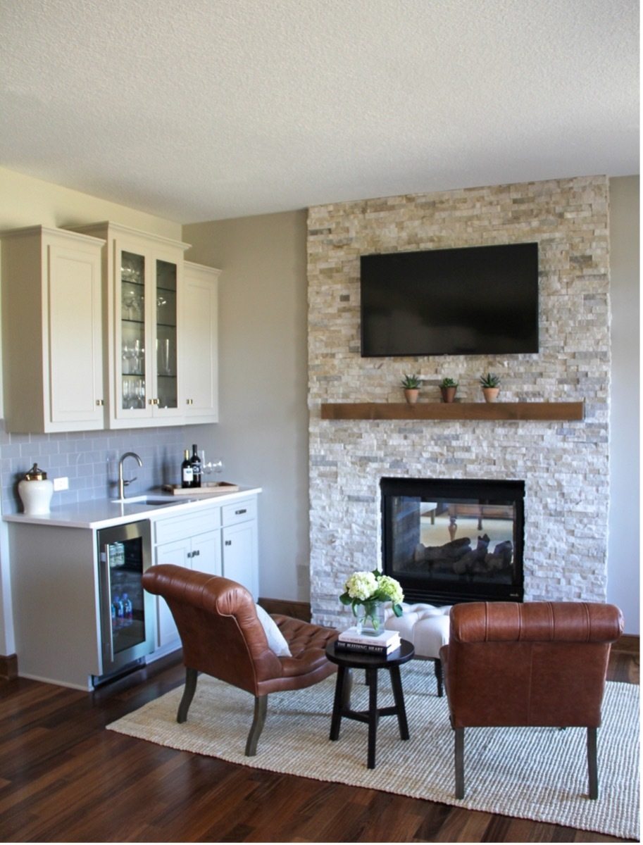 After Photo: The bar cabinets were painted the same color as the island, a light warm gray, a new bar Blanco Siligranit sink and faucet, and bar fridge were installed. For the fireplace, stacked stone was installed and extended to the ceiling to make a focal point.