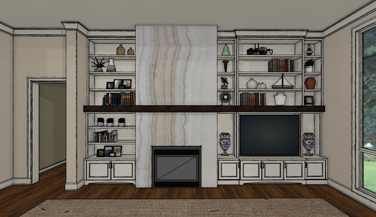 The goal of the main floor living room design was to have a unique fireplace that complemented the homeowner’s art collection. To accomplish this, the designer book-matched a slab of honey onyx as the showpiece for the fireplace. Revival House designer created a wall of built-in cabinetry around this showpiece to provide storage, a place for the TV, and most importantly, plenty of room to display treasures.